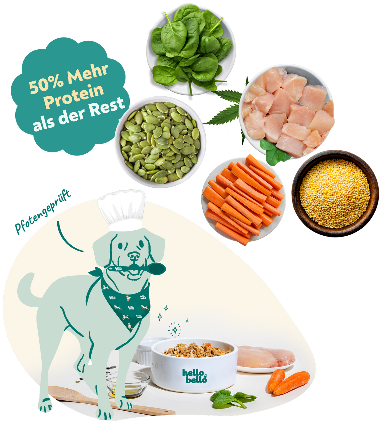 Ersetze 50% des aktuellen Futters deines Hundes durch HelloBello Vollwertnahrung.