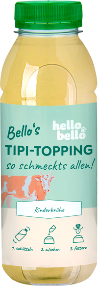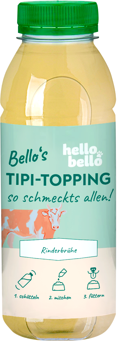 - Unsere leckere Rinderbrühe ist die perfekte Ergänzung zum Futter und kann bei Bedarf untergemischt werden.